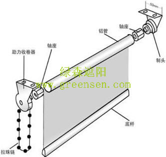 拉珠卷簾其卷管使用40鋁合金管,表面陽極氧化處理。在面料與卷管之間用PVC插片連接。無需縫制,裝配簡單,可在現場改制,在操作過程中制動彈簧以防止面料自由下滑,尾塞轉軸采用銅軸以增加壽命,操作拉珠使用緊密拉珠,使拉珠與珠輪之間受力點增加,從而增加操作的平穩度,其下軌由噴塑底軌組成。